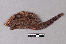 | Description / विवरण | The lower part of a sickle has an elongated narrow butt-end and a curved, broad, flat blade on top. |