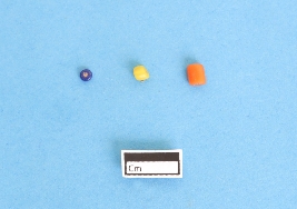 | Description / विवरण | 1 Short, circular shaped bead, blue glass, length less than diameter. It has parallel perforations at the axis. Opaque in nature. Thin, delicate and polished body. Glittery glass 2 Short, circular, barrel shaped bead, yellow glass, length less than diameter. It has parallel perforations at the axis. Opaque in nature. Thin, delicate and polished body. Glittery glass. 3 Short, circular, cylindrical bead, orange glass, length more than diameter. It has parallel perforations at the axis. Opaque in nature. Thick, delicate and polished body. Glittery glass. |