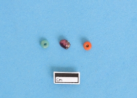 | Description / विवरण | 1 Short, circular, spherical cane bead, cyan glass, length less than diameter. It has parallel perforations at the axis. Translucent in nature. Thick, delicate and polished body. Glittery glass. 2 Short, circular, cylindrical bead, purple glass, length more than diameter, flaked surface, uneven outer profile. It has parallel perforations at the axis. Translucent in nature. Thick, delicate and polished body. Glittery glass. 3 Short, circular, barrel shaped, orange glass, length less than diameter. It has parallel perforations at the axis. Opaque in nature. Thick, delicate and polished body. Glittery glass. |