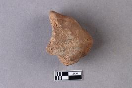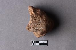 | Description / विवरण | Mahavihara sealing with a broken incuse depicting a chakra motif above and a legend arranged in two lines probably in the Siddhamatrika script. It is yet to be deciphered. |