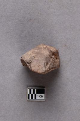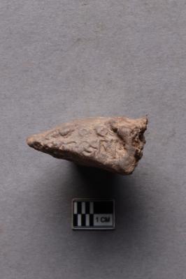 | Description / विवरण | Fragment of a clay lump bearing a partially visible single-line legend with worn-out motifs above it. The legend is yet to be deciphered. |