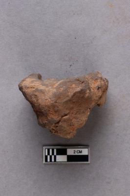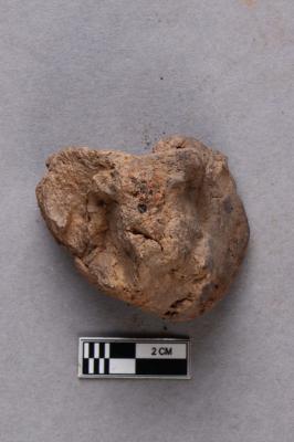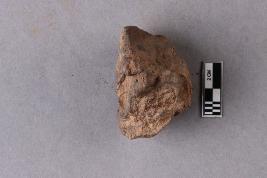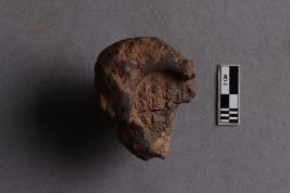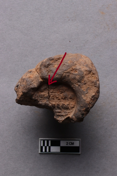 Mahavihara sealing, showing a broken incuse bearing a partially available legend in the Siddhamatrika script, and chakra flanked by deer motif. A knob is also seen at the back of the clay lump.