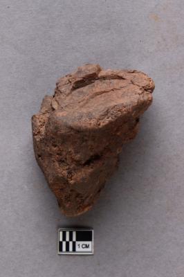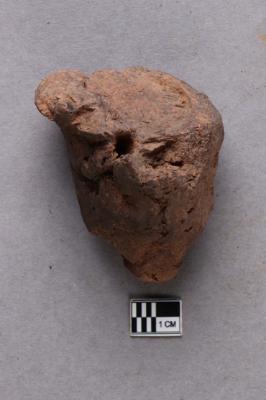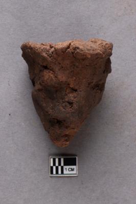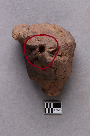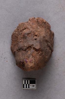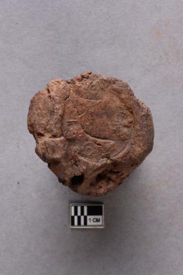 Clay sealing with a circular incuse, details obliterated due to wearing off. There is a raised conical knob at the back.