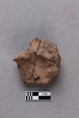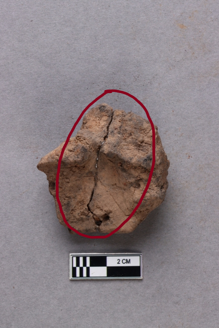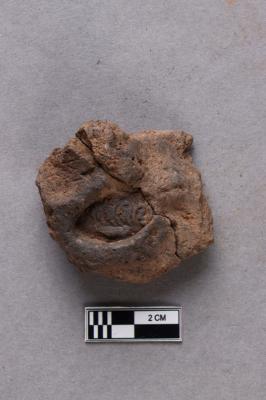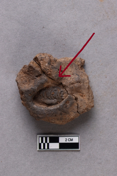 Broken clay lump with an elliptical incuse, bearing a single line inscription.
