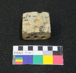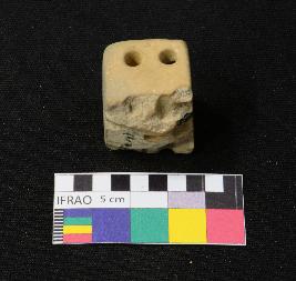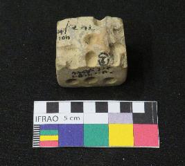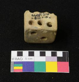 | Description / विवरण | Well fired, broken terracotta dice probably square in shape, is dull red in color, made of well levigated clay having square section, smooth surface and holes on sides which represent numbers. |