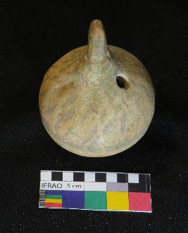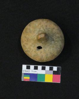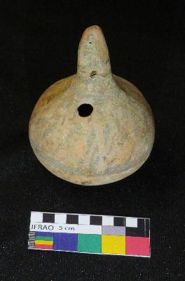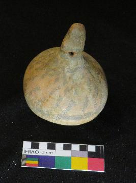 | Description / विवरण | Well fired, painted terracotta rattle is red in color, made up of fine clay having hollow, smooth globular body, knob with curved top and sagar base. It has two perforations one at the base of knob and other on the shoulder. The painting is done on the upper part of body, in black color on the red surface. The painting has oblique stocks and a circle at the mid of body and concentric circles around knob. The object is called rattle because it has a pallet inside the body which produces sound while shaking it. |