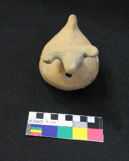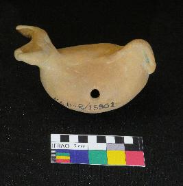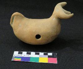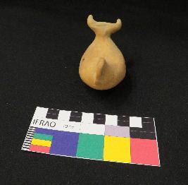 | Description / विवरण | Well fired, animal shaped terracotta rattle, is red in color, made of well levigated clay, having front turned pointed horns, long face, small neck, elongated hollow body, twisted tail and saggar base. It has perforation on either side of stomach and one hole below the neck. The object is called rattle because it has a pallet inside the body which produces sound while shaking it. |