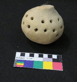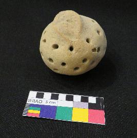 | Description / विवरण | Well-fired, globular-shaped terracotta rattle, is dull red in color, made of well-levigated clay having a broken knob, perforated globular body and saggar base. |