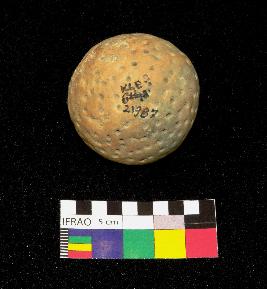 | Description / विवरण | Well fired, broken circular shaped terracotta ball is dull red in color, made of well levigated clay, having round section and pin hole design all over body. |