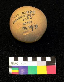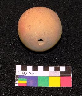 | Description / विवरण | Well fired, globular shaped terracotta ball is red in color, made of well levigated clay, having circular section, plain smooth body and a hole. |