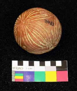 | Description / विवरण | Well fired, globular shaped broken terracotta ball is dark red in color, made of well levigated clay, having circular section and incised design in flower pattern all over body. |