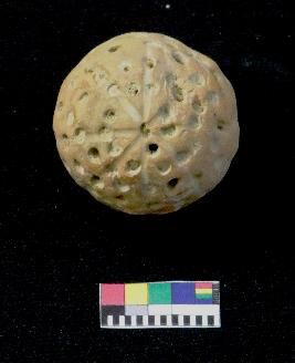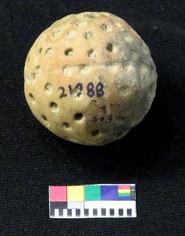 | Description / विवरण | Well fired, globular shaped terracotta ball is dull red in color, made of well levigated clay, having round section ,hole design all over body and thread marks in body. |