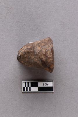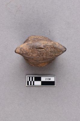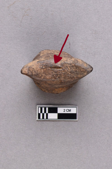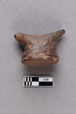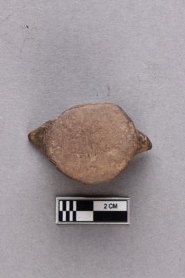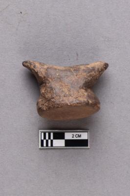 A terracotta object with a flat circular base and two protruding horn-like projections pointing in opposite directions. The surface is greyish and quite polished.