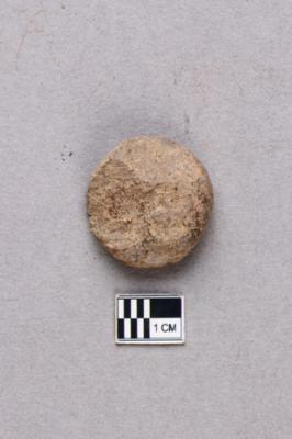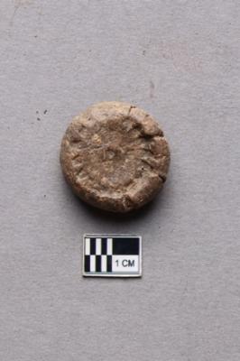 | Description / विवरण | Tiny circular clay lump bearing an impression of a flower or chakra, which appears to be a sealing. |