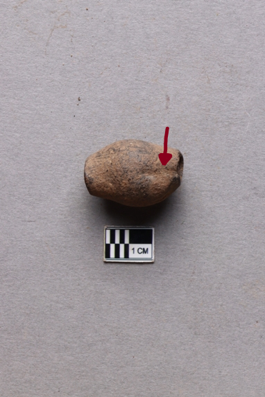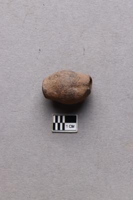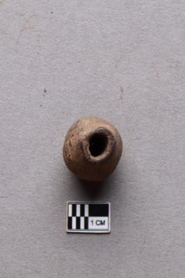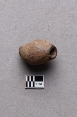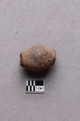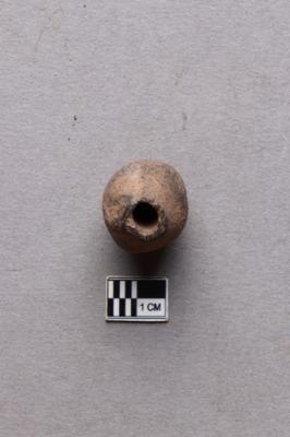 Bicone, grey-coloured terracotta bead with cylindrical drilling.