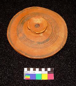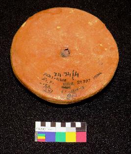 | Description / विवरण | Well fired, handmade painted terracotta wheel is red in color, made of well levigated clay and in circular shape having a knob with perforation. The upper surface is smooth and having painting in black color on red surface. It has a circle at the periphery and four concentric circles on the body. The other surface is smooth and flat. |