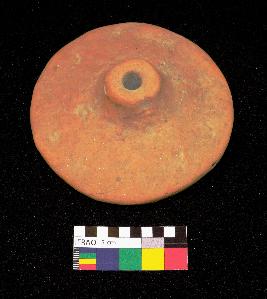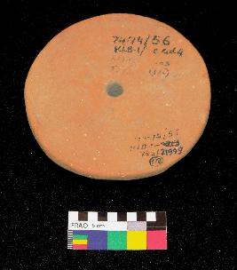 | Description / विवरण | Well fired, handmade circular shaped terracotta wheel is dull red in color, made of well levigated clay having smooth upper surface with circular perforated knob in the center and the other surface is flat. |