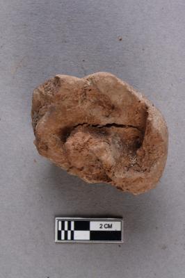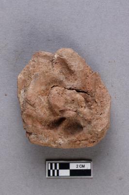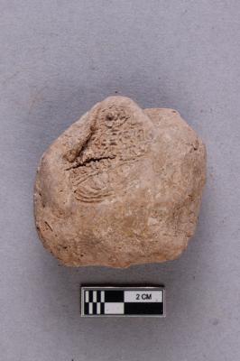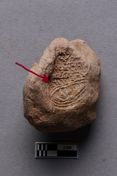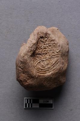 Mahavihara sealing with motifs and legend is not clearly legible due to distortion before baking.