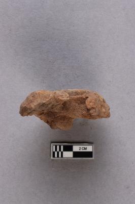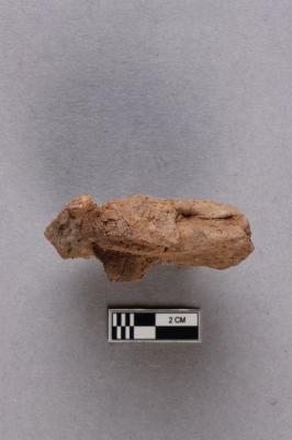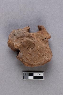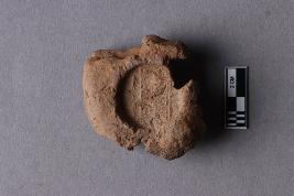 | Description / विवरण | Broken clay lump with a circular incuse bearing a worn-out two-line legend and the chakra and deer motif above the legend. The knob at the back appears to be broken. |