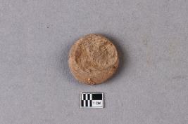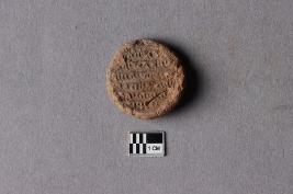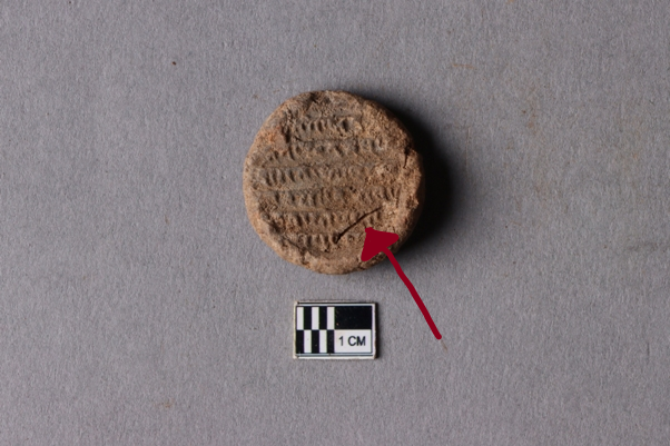 Circular clay sealing with an incuse bearing an inscription of six lines, perhaps dharini. It is yet to be deciphered. Fingerprints are noticeable on the back.