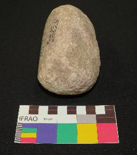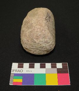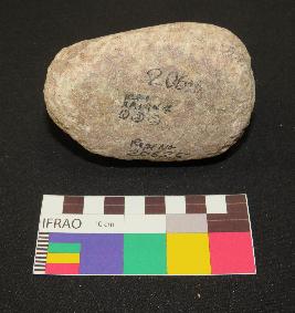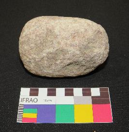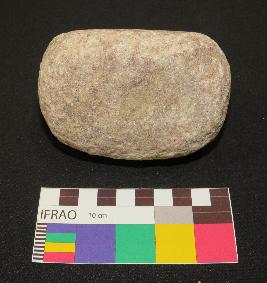 | Description / विवरण | Pink sandstone pestle is in ovoid shaped, contains mica having elongated body, curved ends and triangular section. The object has only one side flat and polished, rest sides have rough surface. |