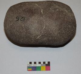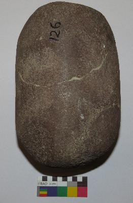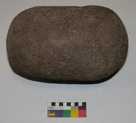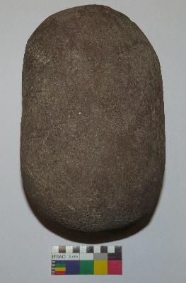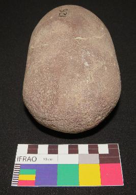 | Description / विवरण | Ovoid shaped, stone pestle is made of medium coarse grain stone, having elongated smooth body, curved ends and circular section. |