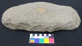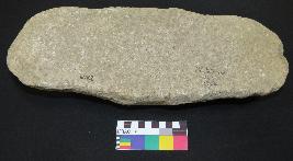 | Description / विवरण | Saddle quern is carved out of medium-coarse grained stone, having long body, curvy sides, almost rectangular section, convex rough base, working area is flat and concave. |