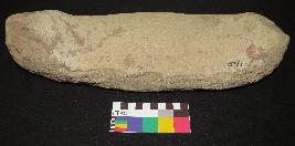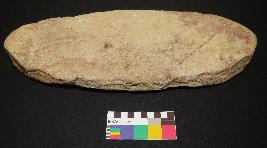 | Description / विवरण | Saddle quern is dull red in color, having long, boat shaped body, rectangular section, concave working area and rough base. |