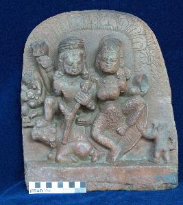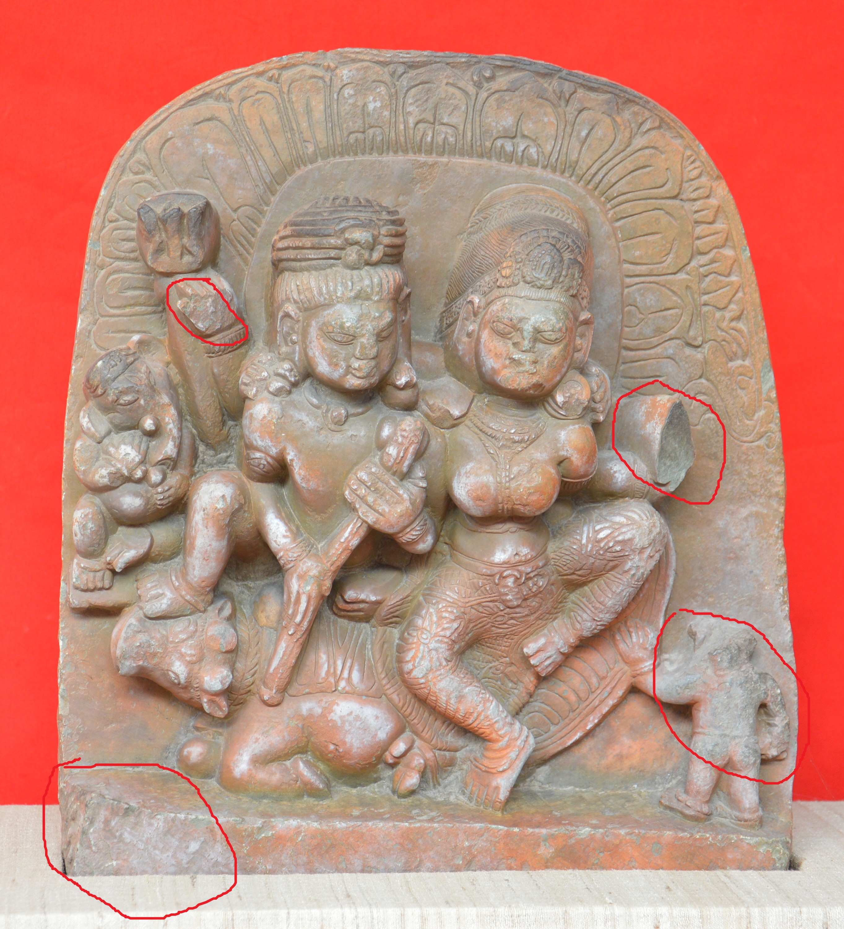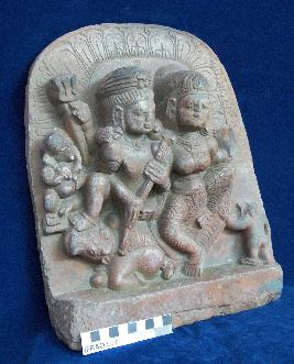 Four armed Shiva seated in lalitasana. The god holds a veena in his front hands, a trident in his back right hand while his back left-hand rests on the left shoulder of Parvati. Two-armed Parvati holds a mirror in her left hand, while her right hand is on the right shoulder of Shiva. Both the deities are wearing crowns, earrings, necklaces, armlets, wristlets and lower garments. Seated Ganesha is depicted on the right middle side of Shiva, and Kartikeya stands near the feet of Parvati.