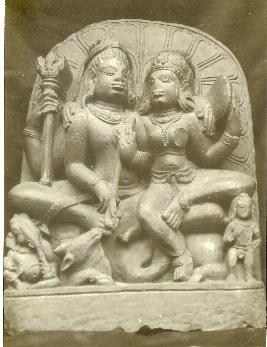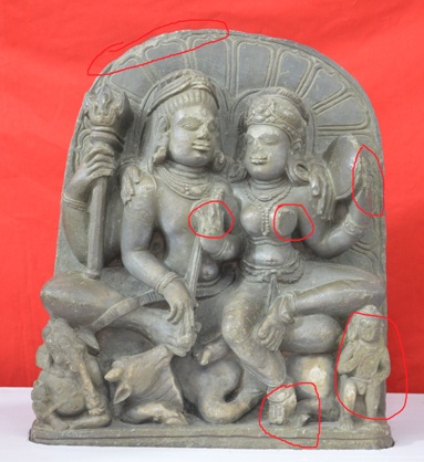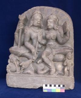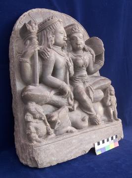 Four armed Siva is seated in lalitasana. Shiva holds a veena in his frontal hands, a trident in one of his right hand while the left-hand rests on Parvati s left shoulder. Two-armed Parvati holds a mirror in her left hand, while her right hand rests on the right shoulder of Shiva. Both deities are wearing crowns, earrings, necklaces, armlets, wristlets and lower garments. Ganesha is seated on the right, Nandi in the middle, and standing Kartikeya in the left are depicted.