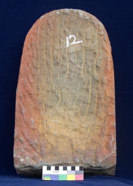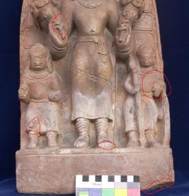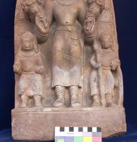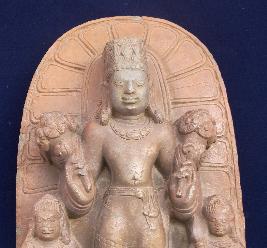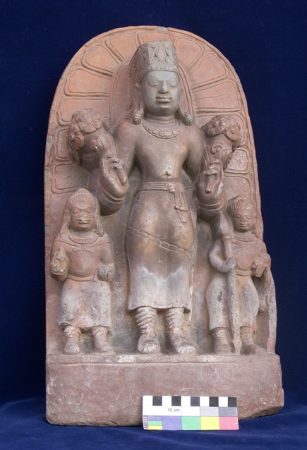 Two-armed Surya is standing in a Samabhanga pose and holding a stalk of full-bloom lotus in both his upraised hands. He is adorned with a crown, ear ornaments, a thick necklace, a yajnopovita, wristlets and girdle with a dagger tucked in his right side. He wears a lower garment and high boots. Pingala on his right and Dandi on his left side are flanking him, both are wearing the same style of dress and ornaments as the main deity.