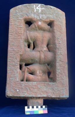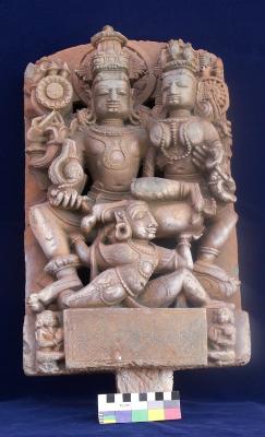 Four armed Narayan (Vishnu) is seated in Lalitasana on Garuda wearing kirit-mukut, earrings, necklace and garland with srivats symbol. The Deity is holding a conch (Shankha) and Padma (Flower) in his right hands while mace and chakra adorn his upper left hand. The lower left-hand touches the breast of Lakshmi. Two armed Lakshmi sitting in the left lap of Narayan also wears kirit mukut holding a flower bud in her left hand while her right-hand rests on the shoulder of Narayan. Garuda, the vahana of Narayan holding the couple deity in his upraised hands.