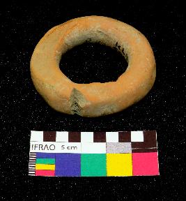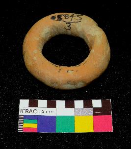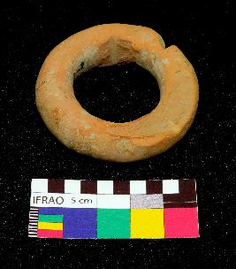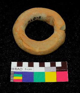 | Description / विवरण | Complete thick terracotta ring is dull red in color, made of well levigated clay, having circular clay and smooth damaged body. |