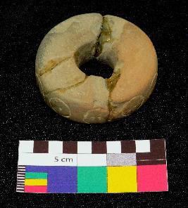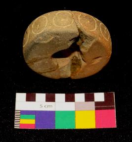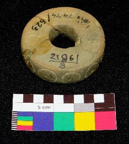 | Description / विवरण | Circular shaped decorated terracotta ring is dull red in color, made of well levigated clay, having flat circular ends with a hole in the center, smooth body, and circular section. The side have incised design in circular pattern. |