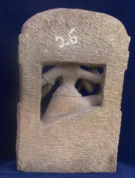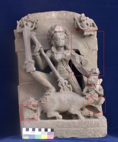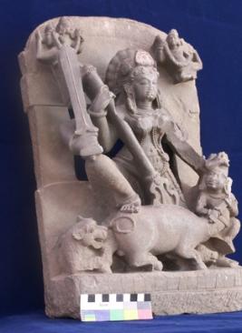 Four-armed sculpture of Goddess Mahisasurmardini adorned with her usual ornaments like crown, earrings, double beaded necklace, armlets, anklets and a printed designed sari as a lower garment. She holds a long trident in her right hand for killing the demon Mahisasur. A sword in her lower right hand. Her left upper hand is broken and her lower left hand mulling the demon. On the upper edge of the sculpture, Gandharvas depicted holding garlands.