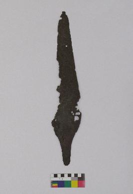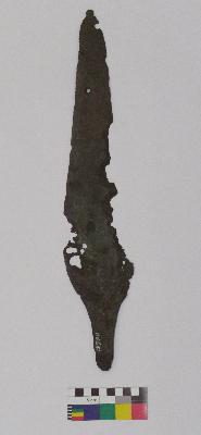 | Description / विवरण | Long spearhead with a tang is made of copper, having pointed tip and hole at the upper part of it. One edge is broken and other is eroded. |
