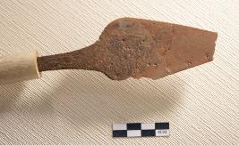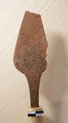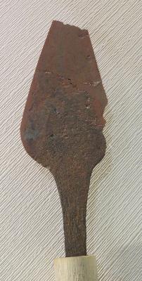 | Description / विवरण | Leaf shaped spearhead is made of copper, having broken top sharp edges and one edge is broken. |