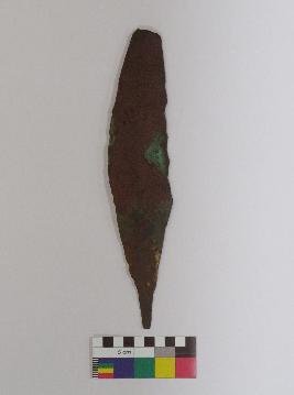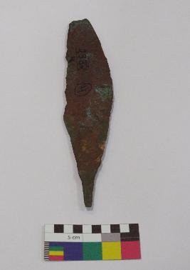 | Description / विवरण | Medium sized, spearhead with a tang is made of copper, having broken top, shaped damaged edges. |