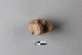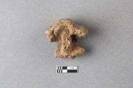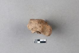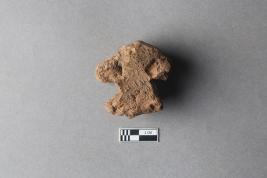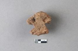 | Description / विवरण | Broken clay lump bearing the partially available Mahavihara legend with the chakra and deer motif above. The alphabets of the legend are missing due to damage and are worn out. |