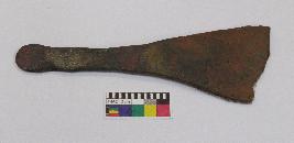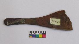 | Description / विवरण | Broken copper spear head is having broken top, and long tang. |