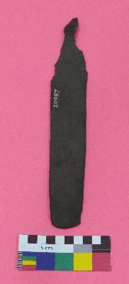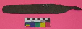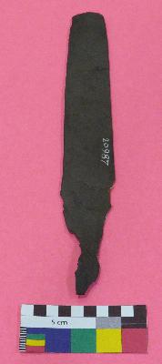 | Description / विवरण | Medium sized, thin knife is made of copper, having crescent shaped top, rectangular flat body, sharp side, damaged lover potion and a broken small tang. |