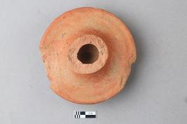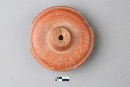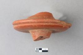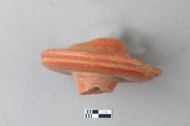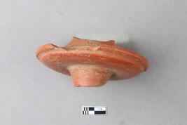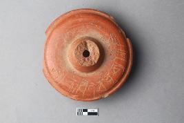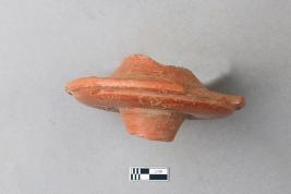| Description / विवरण | Fragment of a sprinkler of red slipware with a post-firing Inscription on the top surface, which reads as श्री की .... The script is probably Siddhamatrika. It is yet to be deciphered. |