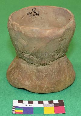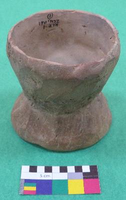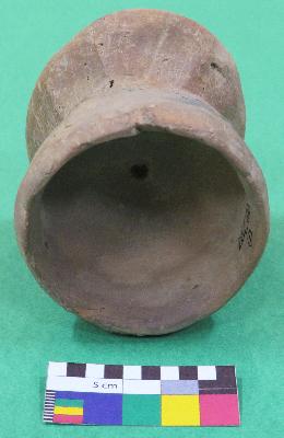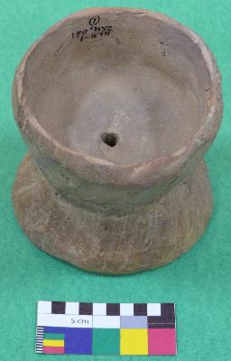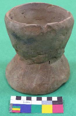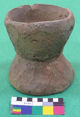| Description / विवरण | Well fired, damru shaped handmade terracotta hour glass, is dull red in color, made of well levigated clay. It has two inverted intersecting circular shaped bowls, a interconnected perforation in the center of bowls and smooth body. |