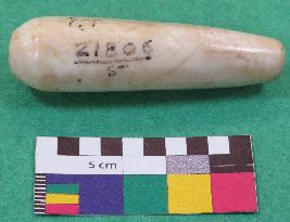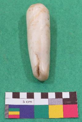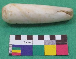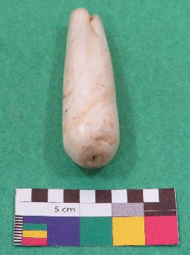 | Description / विवरण | Conical drop shaped plumb bob is whitish in color, made of shell, having narrow mouth, long smooth body, globular base and a perforation from top to bottom. |