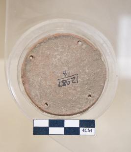 | Description / विवरण | Circular shaped terracotta pan is red in color, made of well levigated clay, having smooth surface, circular base, ridge at the periphery and four perforations. |