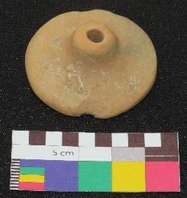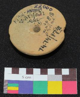 | Description / विवरण | Well fired, handmade small size terracotta round shaped wheel made of well levigated clay, with one side flat and side smooth with small knob. The knob has perforation at center. |
