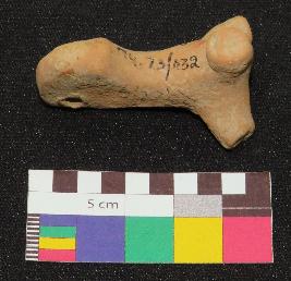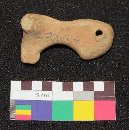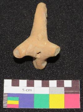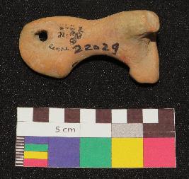 | Description / विवरण | Well fired, red color terracotta animal figure fragmentary part of mechanical toy, is made of well levigated clay, having broken upturned horn, elongated face with nose, and long neck with curved end. It had two hole one at forehead, and other is at lower part of neck. No facial features are visible. |