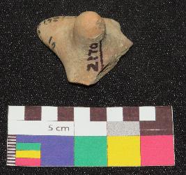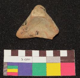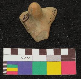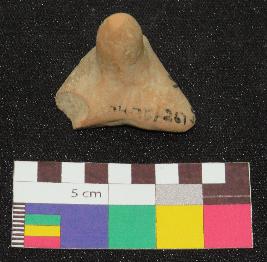 | Description / विवरण | Well fired, dull red color, terracotta gamesman is made of well levigated clay, having probably three footed triangular shallow base and conical knob. |