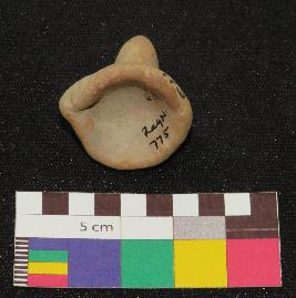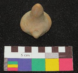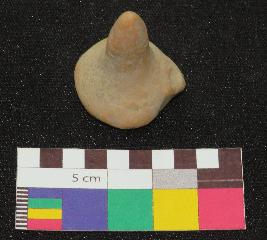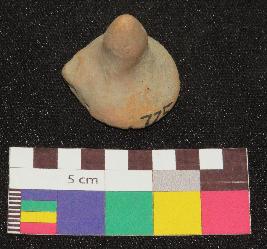 | Description / विवरण | Dull red color, terracotta gamesman is made of well levigated clay, having circular base with one foot and conical pointed knob. |