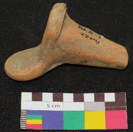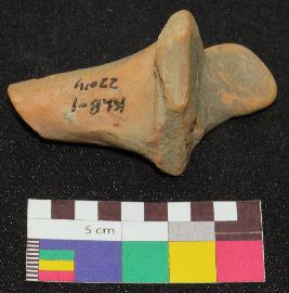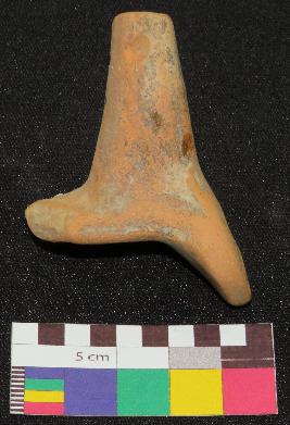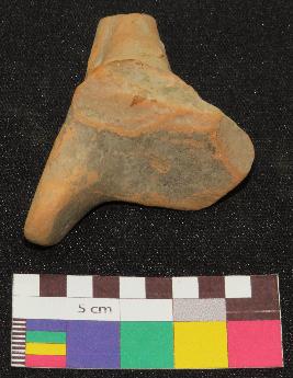 | Description / विवरण | Well fired fragment of terracotta toy cot is in red color, made of well levigated clay, having flat top with pinched corner and broken conical leg. |